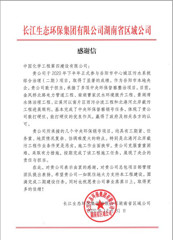 1月1日,新年的第一天,公司岳陽中心城區(qū)污水項(xiàng)目部收到長江生態(tài)環(huán)保集團(tuán)有限公司(湖南省區(qū)域公司)送來的感謝信。在信中,業(yè)主對(duì)公司岳陽污水項(xiàng)目部管理團(tuán)隊(duì)提出表揚(yáng),對(duì)工程建設(shè)過程中面對(duì)工期緊、任務(wù)重、地質(zhì)情況復(fù)雜、協(xié)調(diào)難度大等諸多困難,特別對(duì)建筑片區(qū)施工的北港河北岸截污工程克服重重困難、采取有力措施按期完成工程施工任務(wù)表示肯定,稱贊公司敢于擔(dān)當(dāng)、能打硬仗,展現(xiàn)了央企的責(zé)任與擔(dān)當(dāng)!業(yè)主對(duì)公司各級(jí)領(lǐng)導(dǎo)表示衷心的感謝和誠摯的節(jié)日問候,希望公司一如既往地支持工程建設(shè),圓滿完成岳陽市中心城區(qū)污水二期建設(shè)任務(wù)。