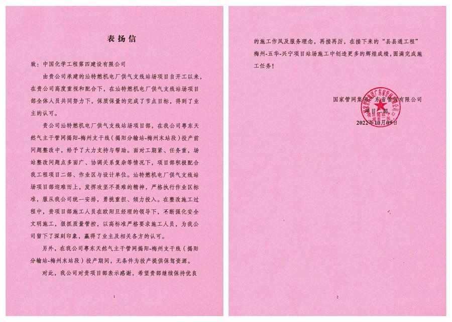 10月9日,東北公司收到國家管網(wǎng)集團廣東省管網(wǎng)有限公司項目二部發(fā)來表揚信,對東北公司承建的汕特燃機電廠供氣支線站場項目保質(zhì)保量完成節(jié)點目標以及為粵東天然氣主干管網(wǎng)揭陽—梅州支干線(揭陽分輸站—梅州末站段)投產(chǎn)過程中做出的貢獻,給予表揚和感謝。