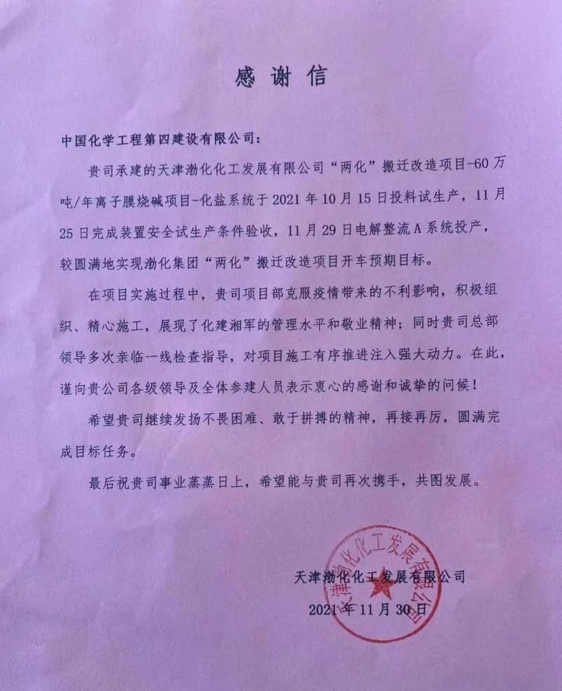 2021年11月29日,天津渤化“兩化搬遷”60萬噸離子膜燒堿項(xiàng)目電解整流A系一次送電成功,相繼產(chǎn)出燒堿、鹽酸等合格產(chǎn)品,進(jìn)入試生產(chǎn)階段。