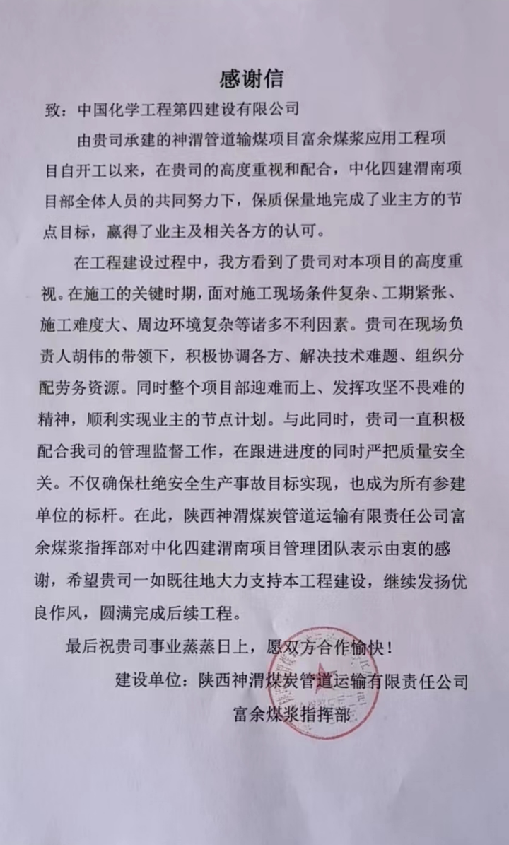 1月5日,中化勞務(wù)公司收到陜西神渭煤炭管道運(yùn)輸有限責(zé)任公司富余煤漿指揮部發(fā)來的感謝信,對中化勞務(wù)承建的神渭管道輸煤項(xiàng)目富余煤漿應(yīng)用工程項(xiàng)目保質(zhì)保量完成節(jié)點(diǎn)目標(biāo),贏得業(yè)主及相關(guān)各方的認(rèn)可,表示感謝。