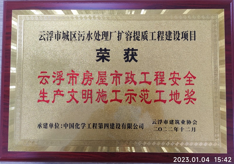 1月4日,由華南公司承建的云浮市城區(qū)污水處理廠擴(kuò)容提質(zhì)工程項(xiàng)目獲評2022年云浮市房屋市政工程安全生產(chǎn)文明施工示范工地。