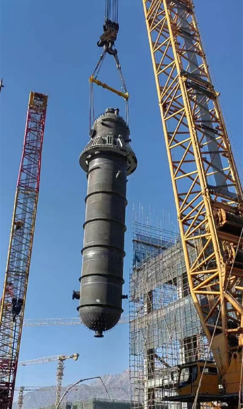 該甲醛吸收塔直徑 4.4米、高74米、重118噸,是該項目現(xiàn)場最大、最重設(shè)備。在吊裝中,項目施工人員采用抬運法,即以265噸履帶吊為主吊,180噸履帶吊輔助,兩輛吊車相互配合、緊密協(xié)作,順利完成甲醛吸收塔吊裝。