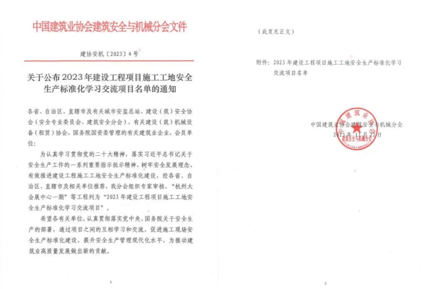 近日,中國建筑業協會建筑安全與機械分會公布《2023年建設工程項目施工工地安全生產標準化學習交流項目名單》,華東公司承建的中國絲路科創谷起步區1、3、7、8單元項目榮獲“全國建設工程項目施工工地安全生產標準化學習交流項目”稱號。