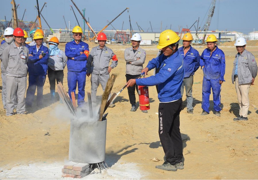 演練中,項目安全總監(jiān)首先就應(yīng)急預案、消防知識、逃生要領(lǐng)、滅火器使用方法等進行詳細說明。隨后,在現(xiàn)場模擬火災現(xiàn)場,組織土建施工一隊員工開展滅火演練。通過強化責任分工、員工密切配合,項目部順利完成演練流程,達到預期效果。