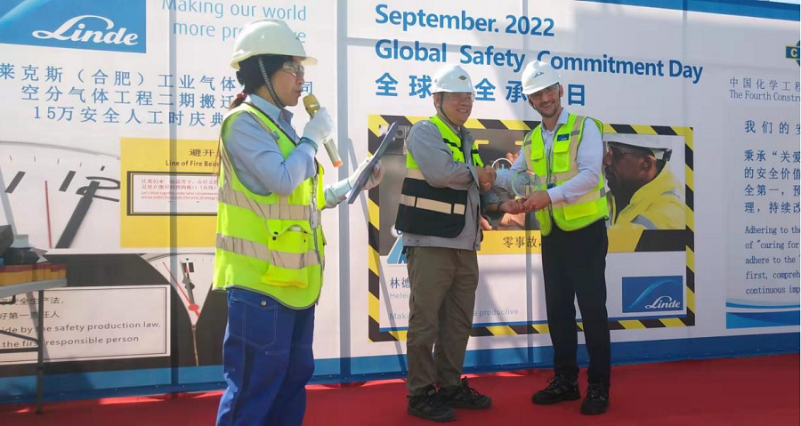 9月19日下午,華東公司普萊克斯(合肥)工業氣體有限公司空分氣體工程二期搬遷項目在現場舉行15萬安全工時慶典。業主林德亞太區總監羅伯特出席慶典。